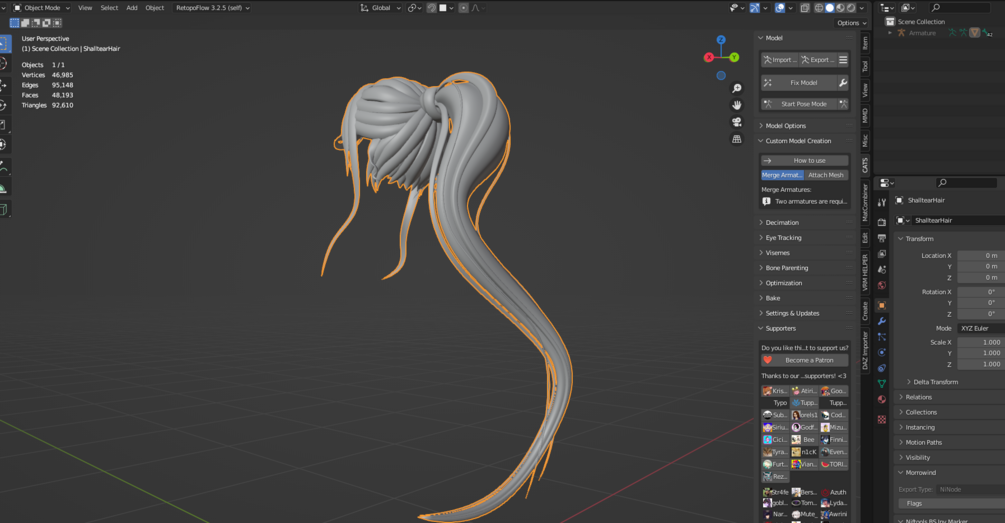 Hair that I had modeled a few months back with intended personal use. The hair is fully rigged with a properly named format for easy use to transfer over to your own model via the head bone. The mesh is UV mapped in a way where a majority of the hair is mirrored to mitigate work when texturing. I personally have never made a texture for this model due to my lack of skill in said category, though I do have images of me using it in-game with mat-caps and shaded outlines for depth and detail. Keep in mind that the images used in Vrchat will not always represent the outcome of how you build the hair for your personal use.